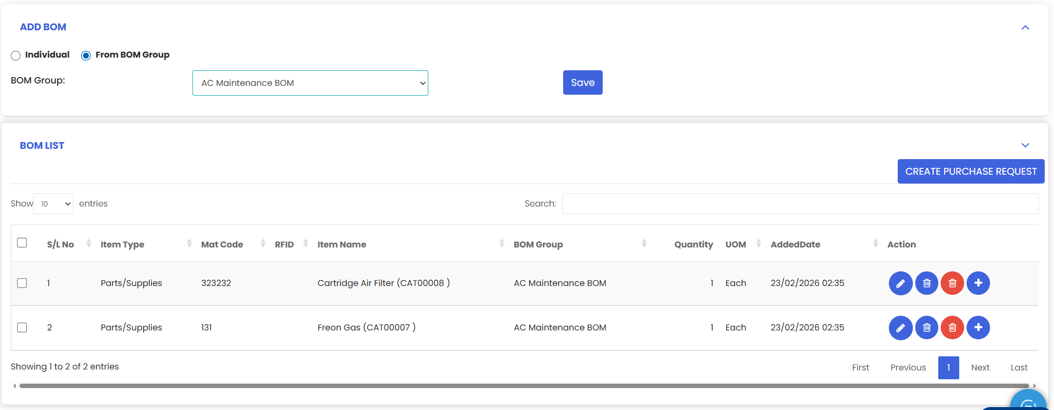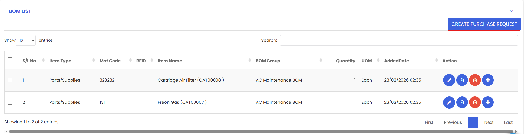 - Option 2: Click the + icon in the Action column next to an individual item to create a purchase request for that specific item.