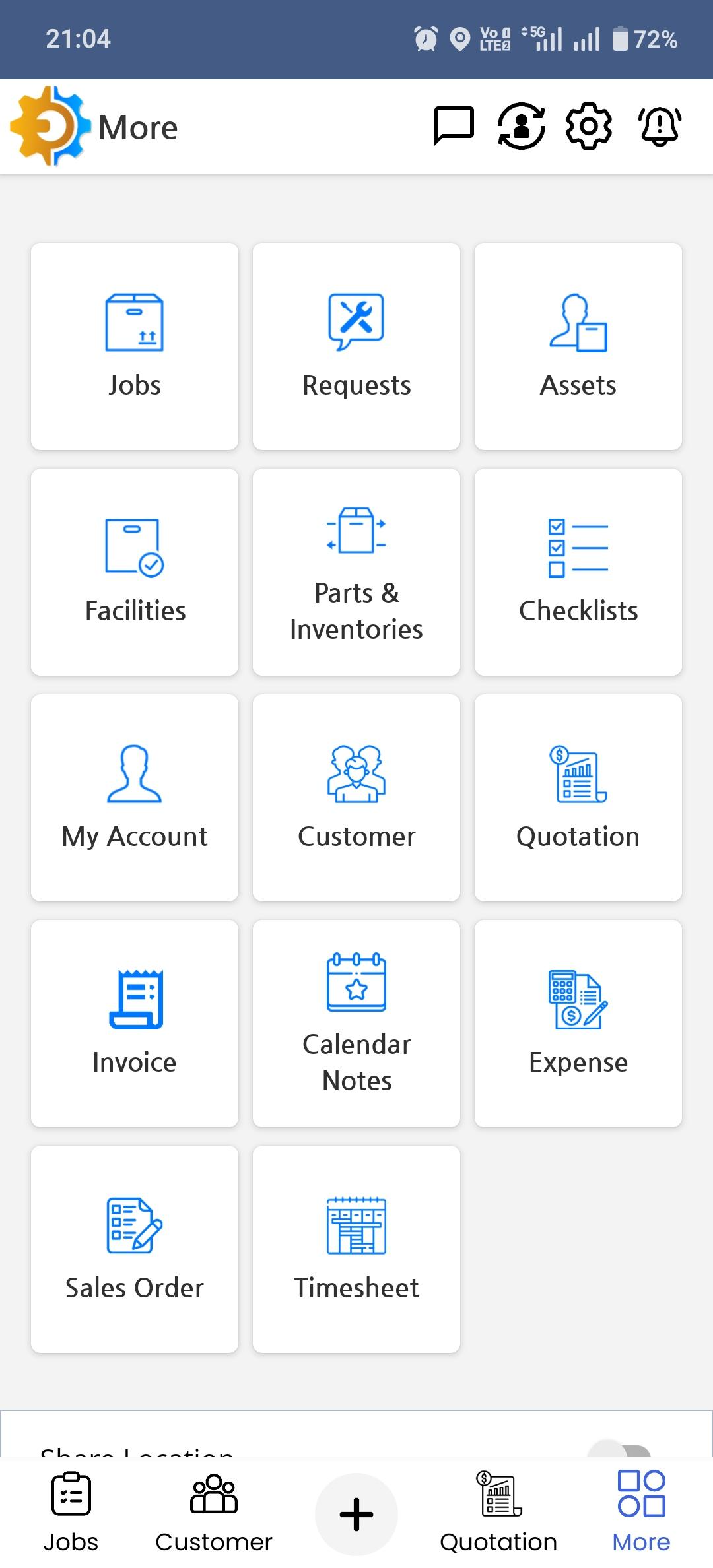 Tap on the More menu in the DreamzFSM mobile app and select Expense from the list of available options to navigate to the Expense section.