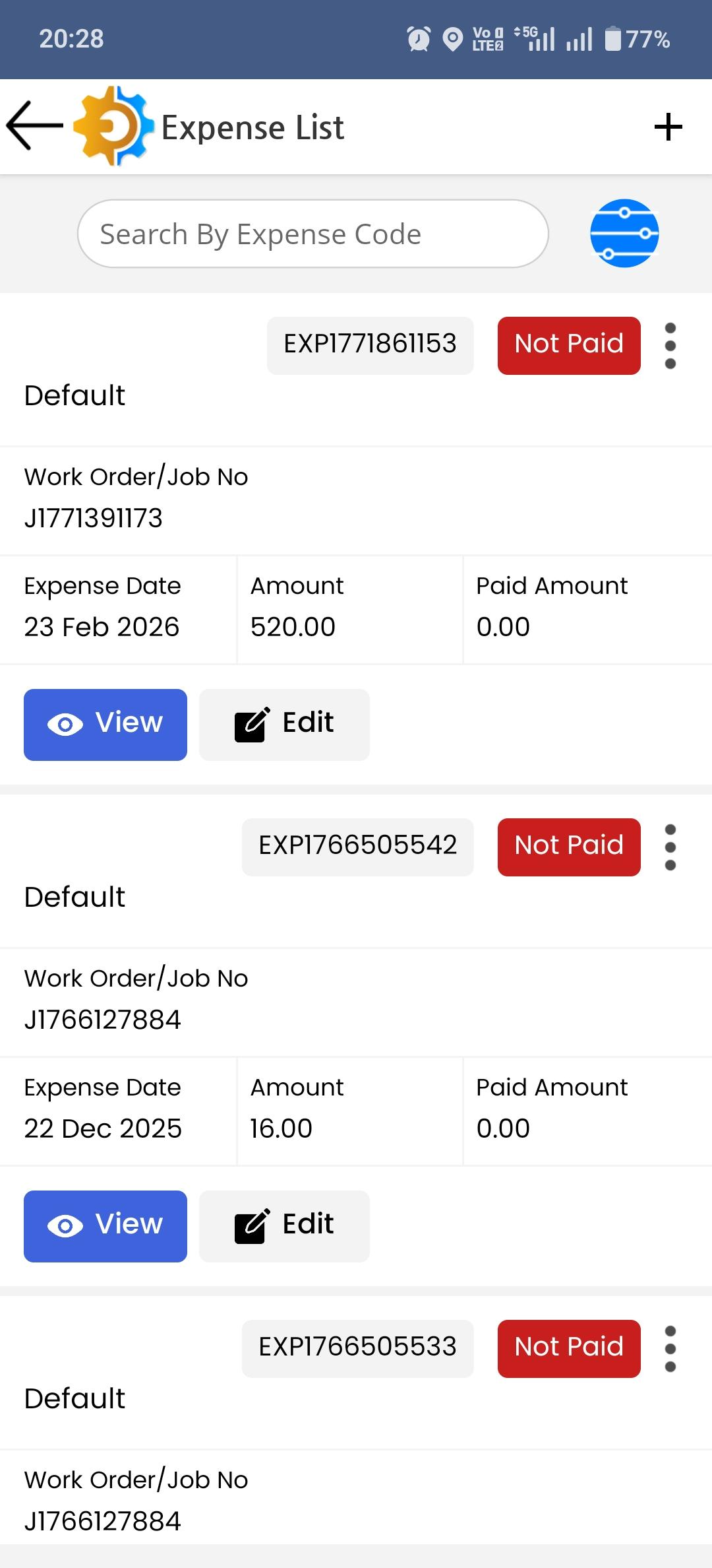 All previously added expenses are displayed in the Expense List screen, which you can access from the More menu. Each entry shows details such as the expense code, business name, date, amount, and payment status.