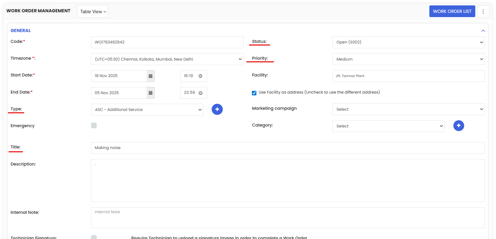 4. It will open the work order page. Change the due date, maintenance type and priority