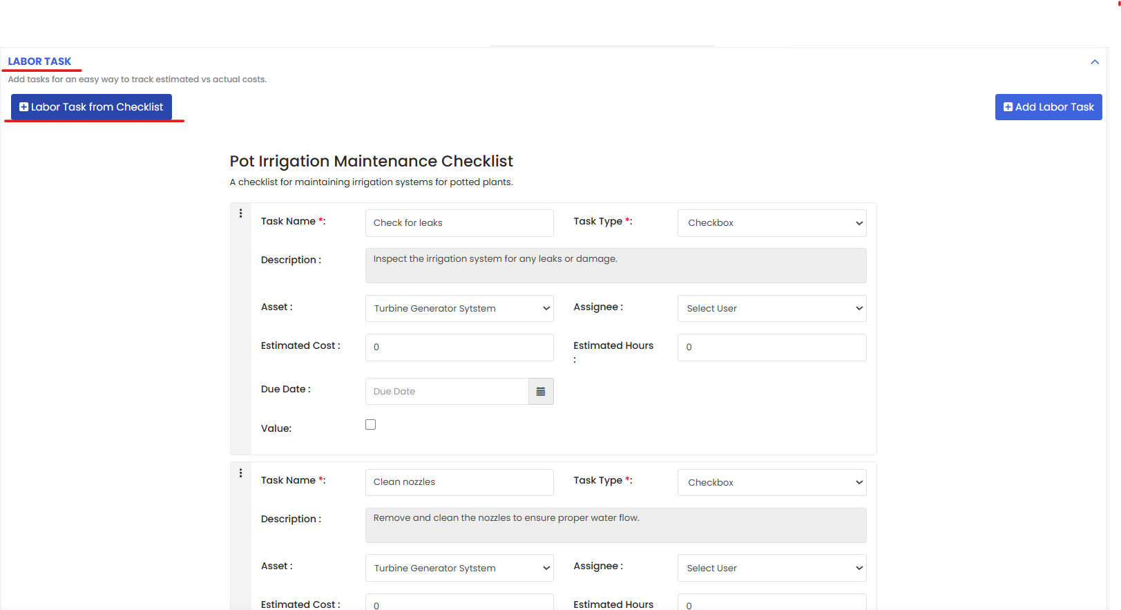 7. Add the labor task checklist from Labor Task section
