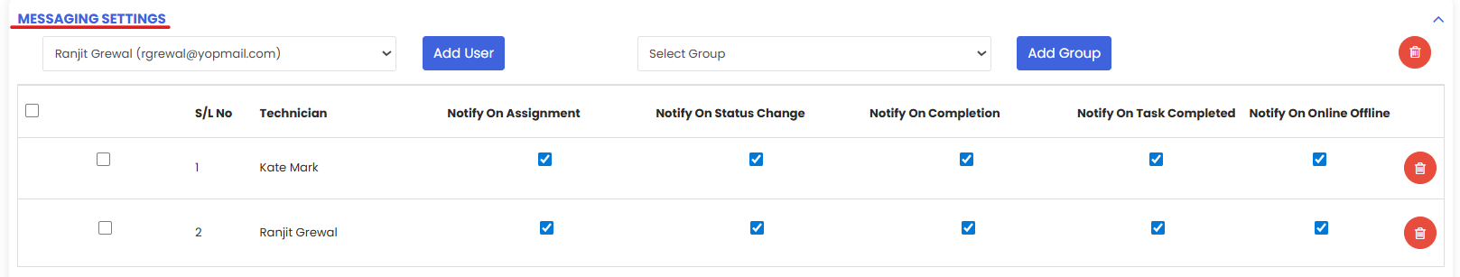 8. Go to the message section and set the notification. For this select technician from drop down and click respective event wise check box.