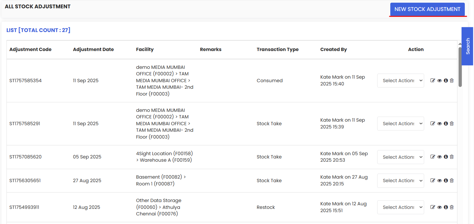 1. Once saved, you will see the updated stock listed in the main "Stock Adjustment" screen.