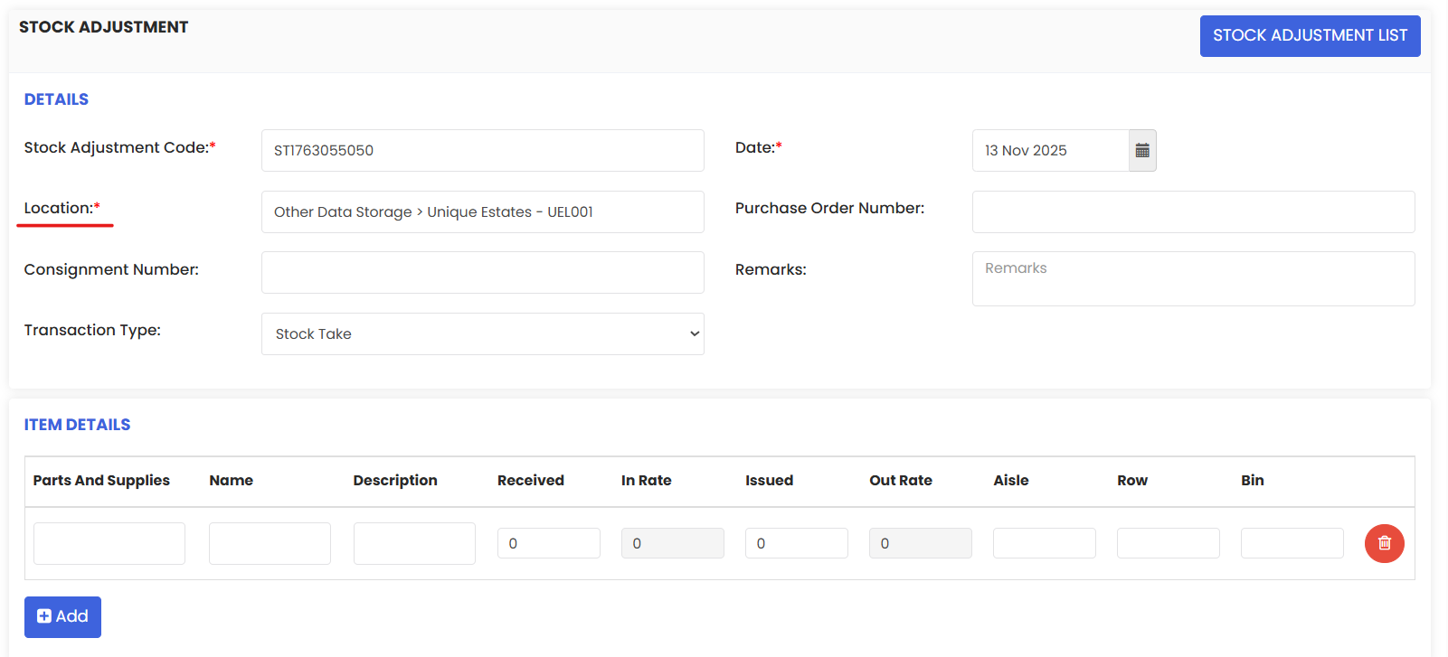 • You need to fill in mandatory fields such as Stock Adjustment Code (pre-filled), Date (pre-filled with today’s date), and Location. Additionally, there are options to include other fields.