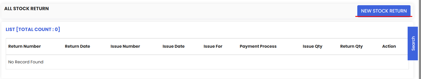 Click on "Stock Return List" to access the relevant screen from which we can click on the right hand top corner “ New Stock Return”.