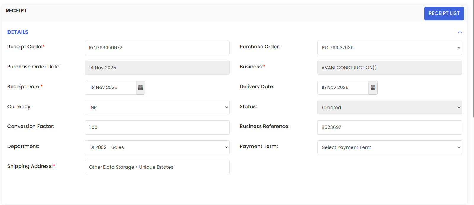 2. To create a Purchase Receipt from a PO click on the + icon. The Receipt page will open up where you need to check the item details that are present.