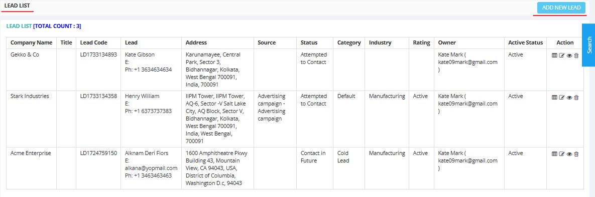 Clicking on the add lead tab will land you to the below screen where you can start by adding basic information of the lead like contact, address, lead source and so on as shown below. You also have drop down options for certain information like lead source, industry,lead status and so on. The fields marked in red are mandatory.