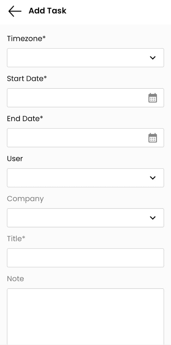 This form contains start and end date, User drop down to assign task to user, Company dropdown to tag the company, title and notes