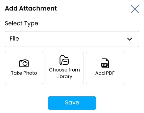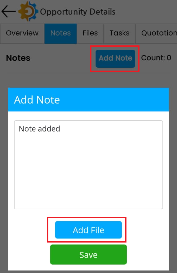 Tap on Add Note button, it opens a popup to add text, it has Add File button to attach any document. Tap on Save button