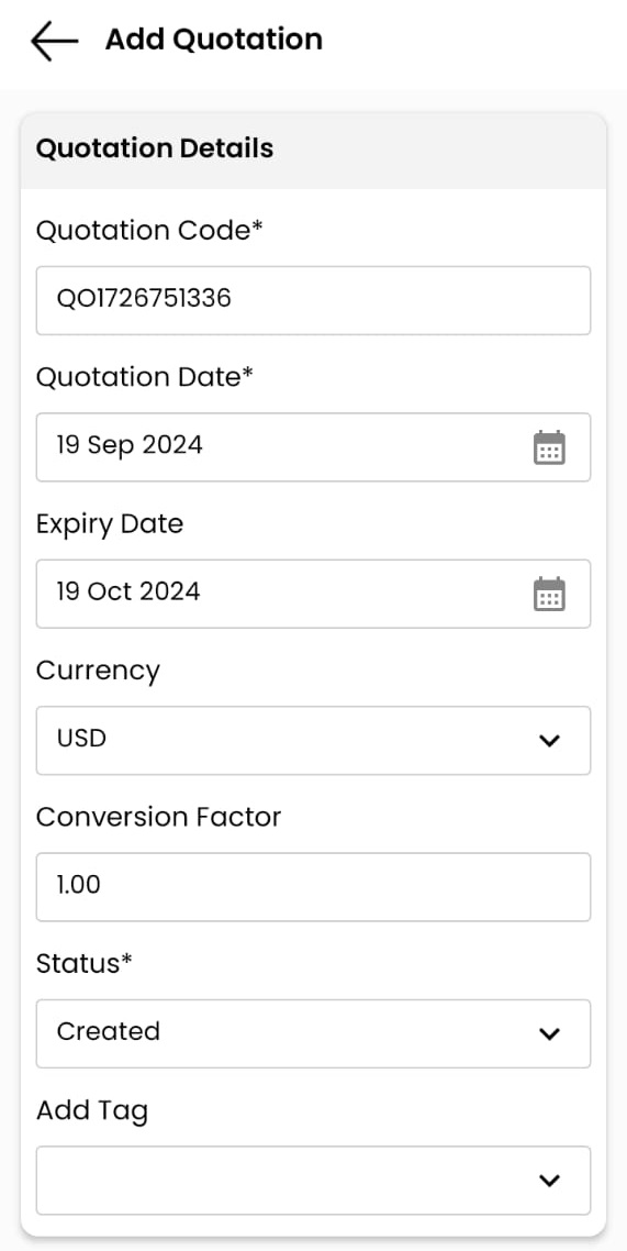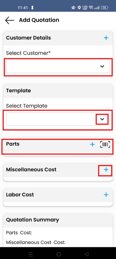 Tap on + sign to add customer, pre-defined templates, items and Miscellaneous cost,