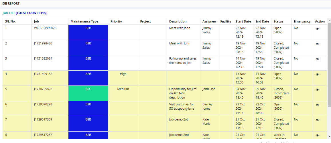 The Job Report in DreamzCMMS provides a detailed overview of jobs in field sales, showcasing key details such as Job ID, maintenance type (B2B/B2C), priority levels, project associations, job descriptions, assigned personnel, facilities, start/end dates, job statuses (e.g., Open, Completed, Incomplete), and emergency indicators. Each job includes an option to view additional details, enabling easy tracking and management.