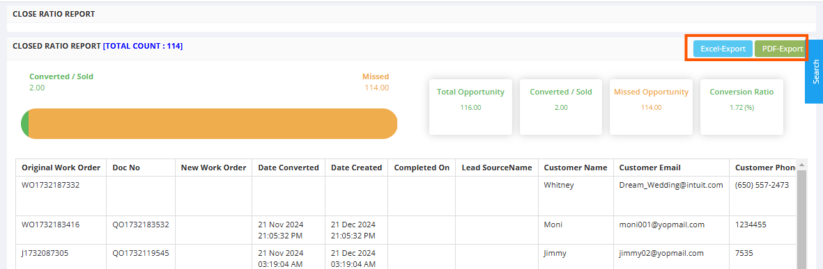 The Close Ratio Report provides an analysis of the conversion of opportunities into successful sales during projects.The report includes detailed information for each opportunity, such as work order details, conversion and creation dates, lead sources, and customer contact information.