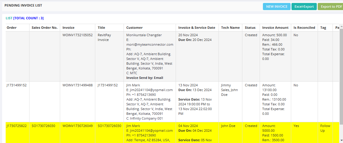 Customer Follow-Up: Provides customer and service details, aiding in communication and follow-ups for outstanding payments.