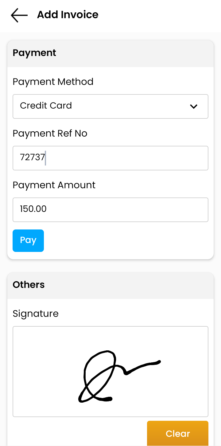 A technician or sales personnel user can create an invoice from the mobile app.