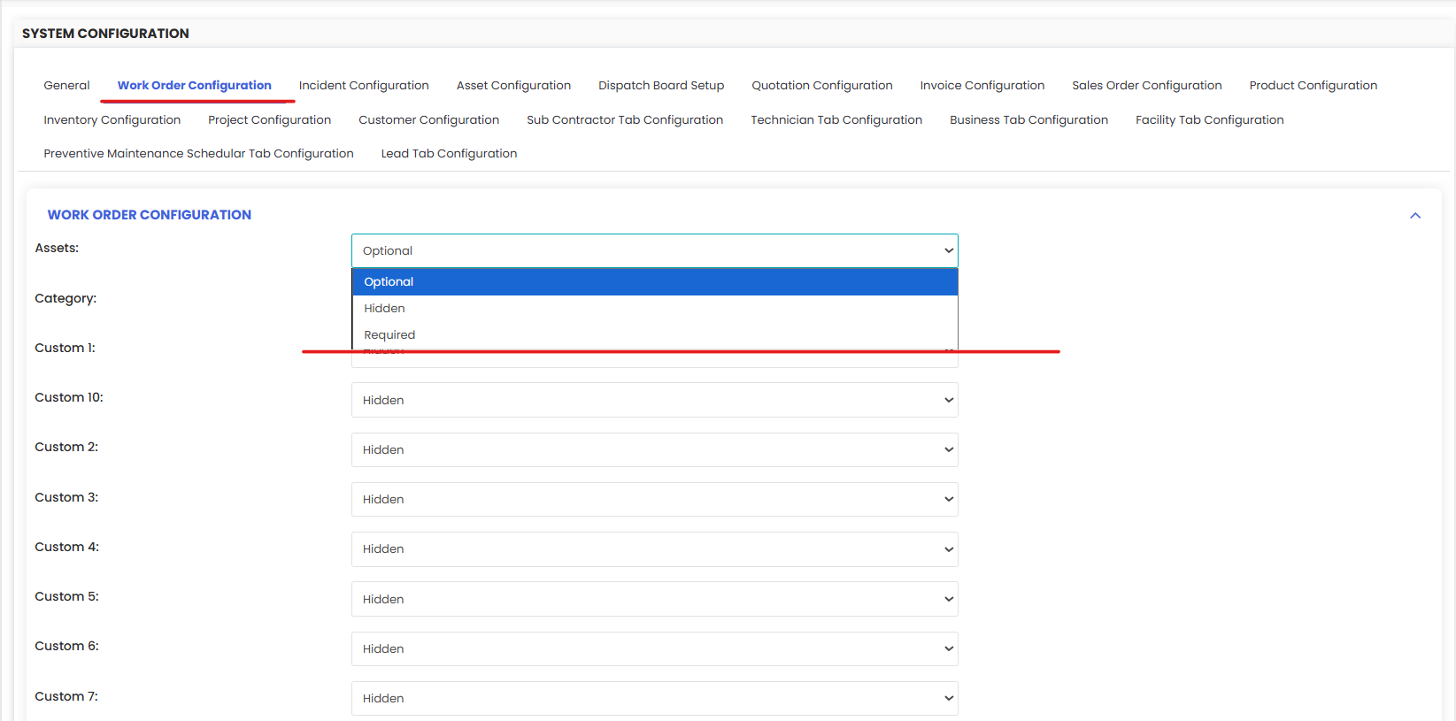 Work Order Fields Configuration lets admins control which fields appear on work orders and how strictly they are enforced. For each field such as Asset, Category, and Custom 1–10 set the status to Required, Optional, or Hidden. These rules shape the technician form, improve data quality (e.g., forcing asset selection), and keep screens uncluttered by hiding unused fields. Adjust once here and the settings apply across WO creation and edits.