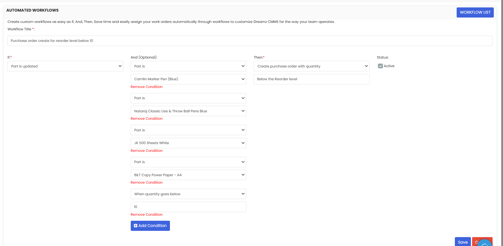 Workflow Automation in DreamzCMMS allows you to define rule-based logic that acts on Purchase Orders based on conditions you set. Rules follow an IF – THEN (or IF – AND – THEN) structure: when a trigger condition is met, the system automatically performs the configured action. This removes the need for manual intervention in routine procurement steps and ensures consistent processing across your organisation.
