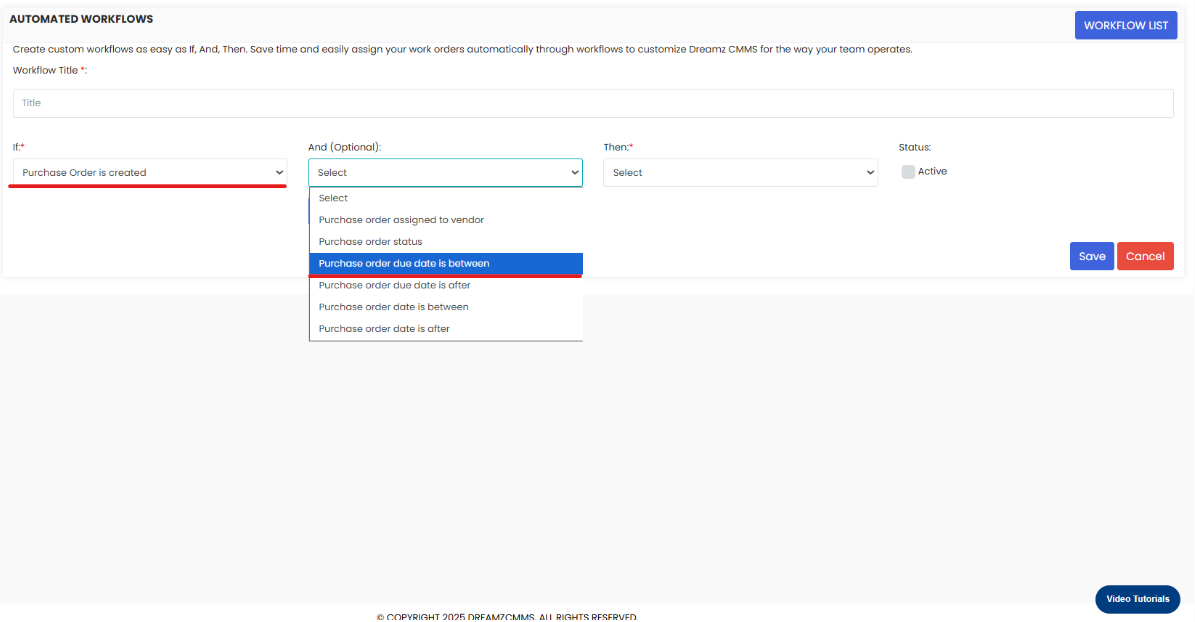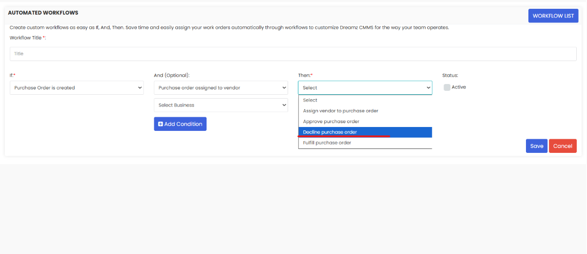 Purchase Order Workflow Automation in DreamzCMMS lets you handle PO steps automatically using simple IF / (optional) AND / THEN rules. Choose a trigger (e.g., PO is created/updated), add conditions (vendor, status, order date/due date ranges), and select actions like assign vendor, approve/decline PO, mark fulfilled, or send notifications. Enable the rule to standardize approvals, prevent delays, and keep a full audit trail no manual chasing.