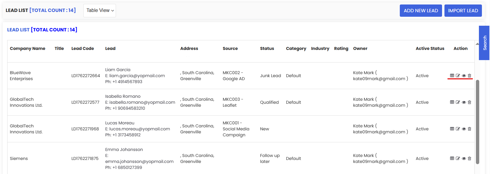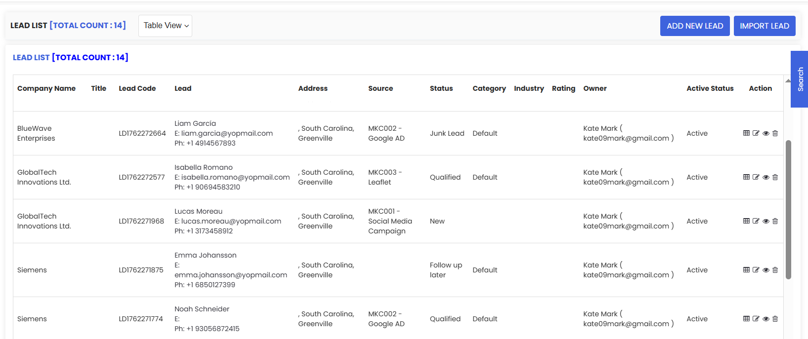 2. The lead list opens up with details like company, contact, lead code, address, source, status (New, Qualified, Junk, Follow-up later), category, industry, rating, owner, and active status.
