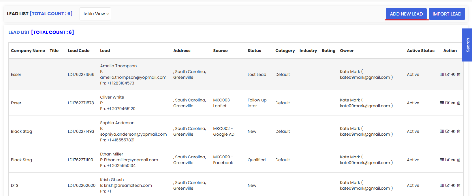 The Add Leads feature lets you capture new prospects in a few clicks and keep their details organized for follow-up. Go to Leads → Add New Lead, enter the required basics Company Name plus at least one contact (email or phone) then enrich the record with name/title, status (e.g., New, Qualified), source (campaign, referral), category/rating, and industry. You can also add address, website/socials, notes, attach files, and mark the lead Active. Hit Save to create the lead; it immediately appears in the Lead List for assignment, nurturing, and conversion to opportunities or customers.