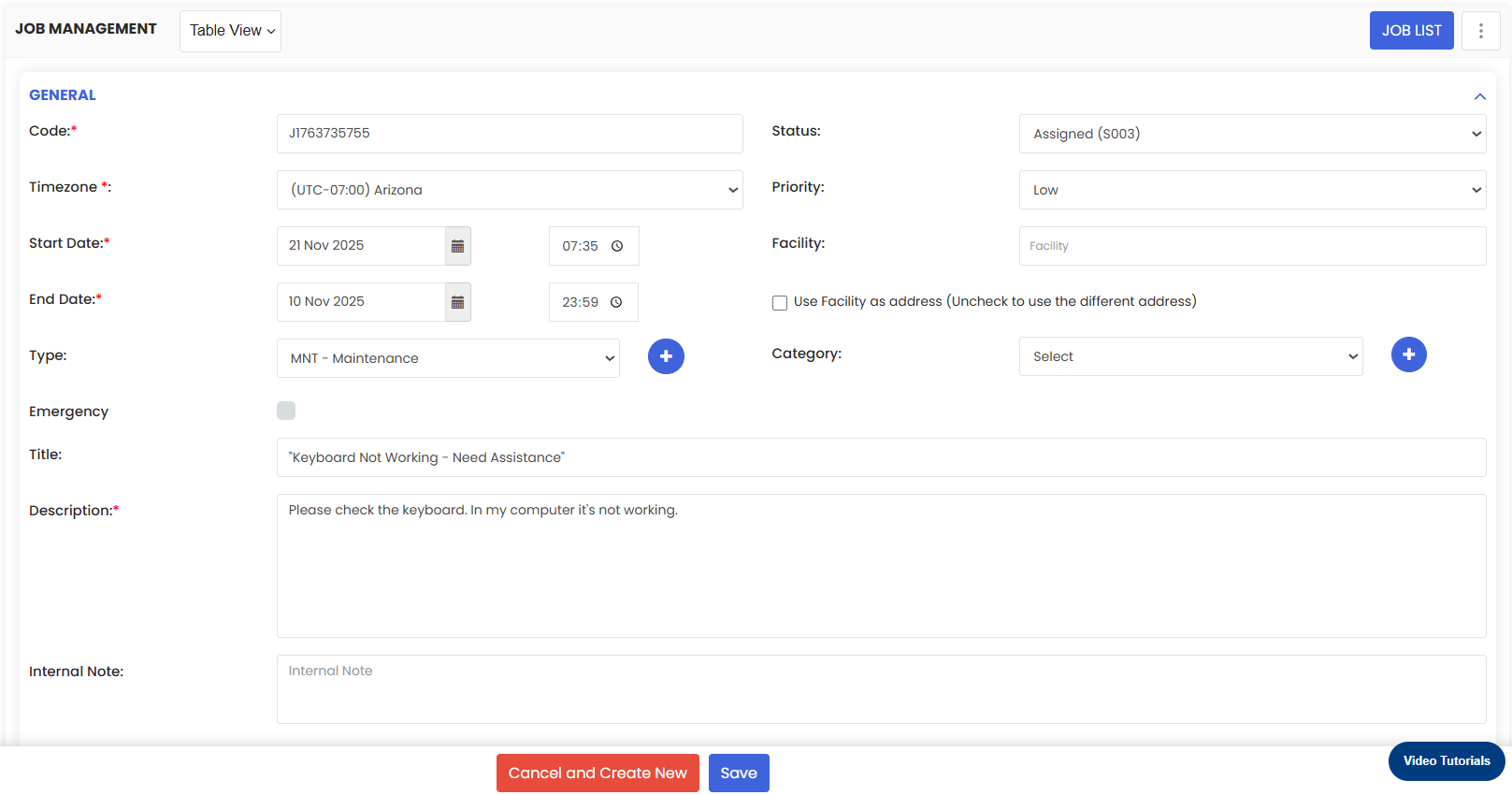 4. It will open the Job page. Change the due date, maintenance type and priority