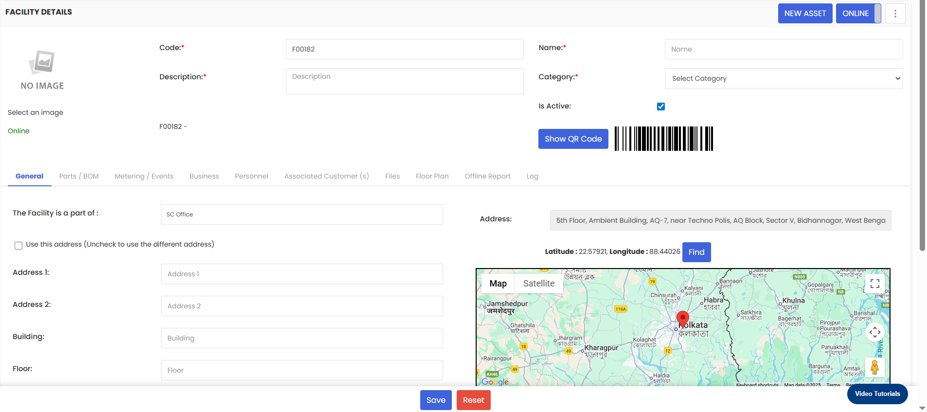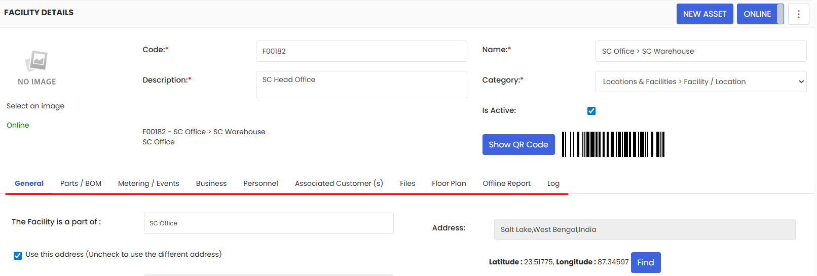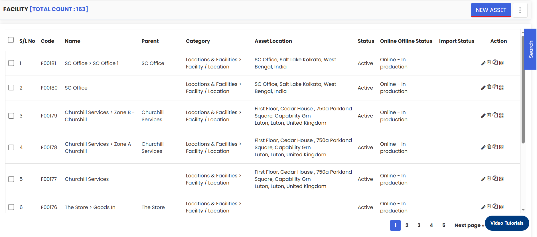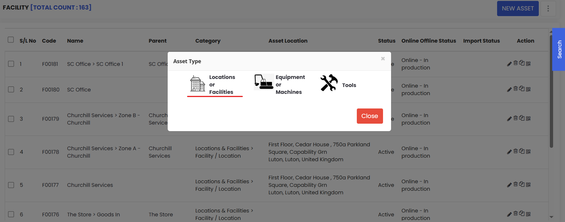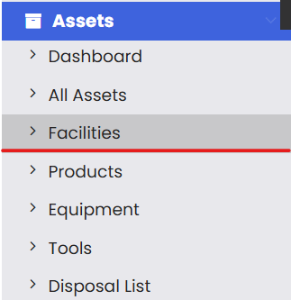 On clicking you will be navigated to the Facility listing page from where you can click on the New Asset button as shown here.