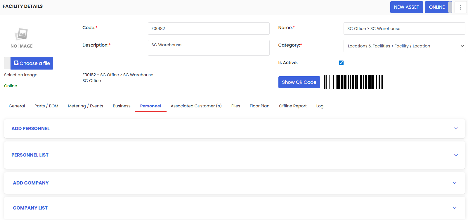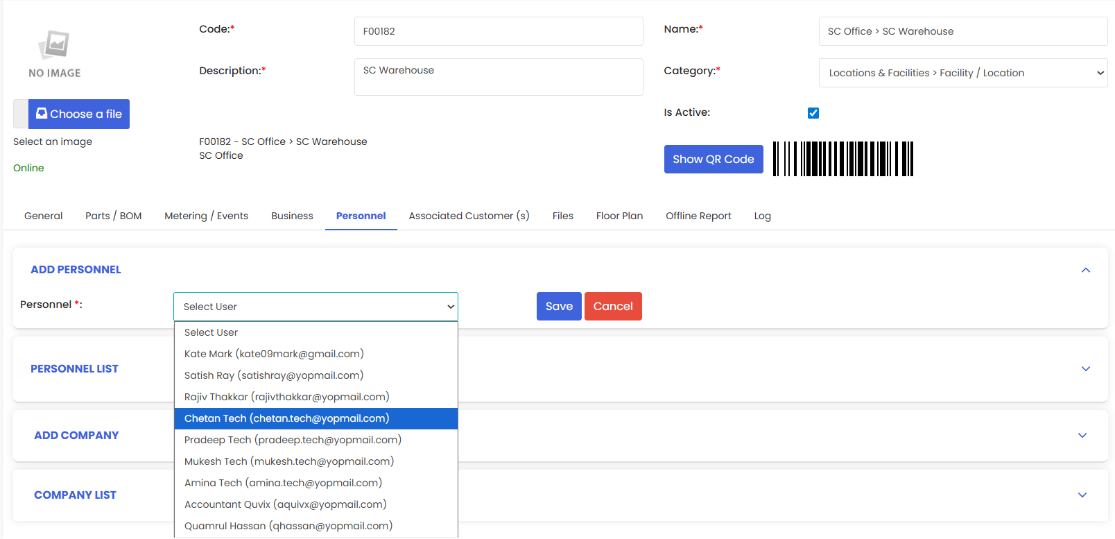 Use the Personnel tab to link internal users and service companies to this facility. Add people for work-order visibility and notifications, attach vendors for onsite work, and manage contacts in the lists below.