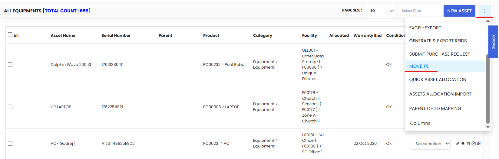 2. From the listing page select an asset that you want to move then go to the 3 dots and then click on Move To.