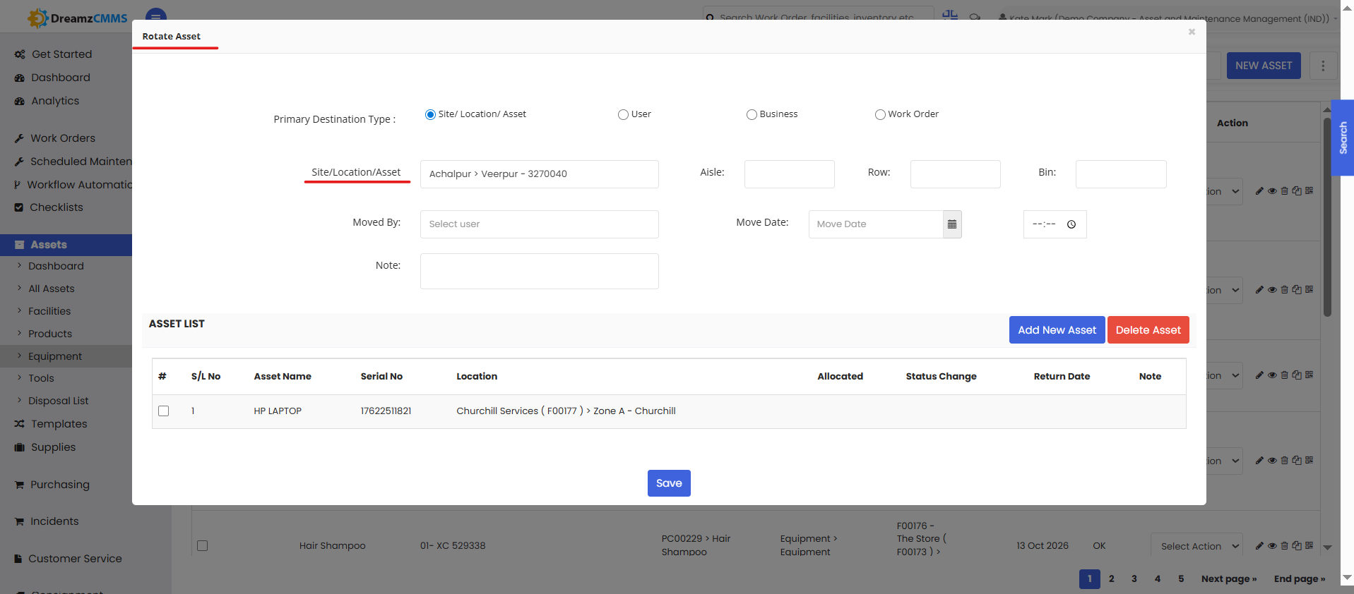 3. Upon clicking, the asset rotation pop-up opens up as shown. Now choose the location where you want to move this asset and fill up other details and click Save.