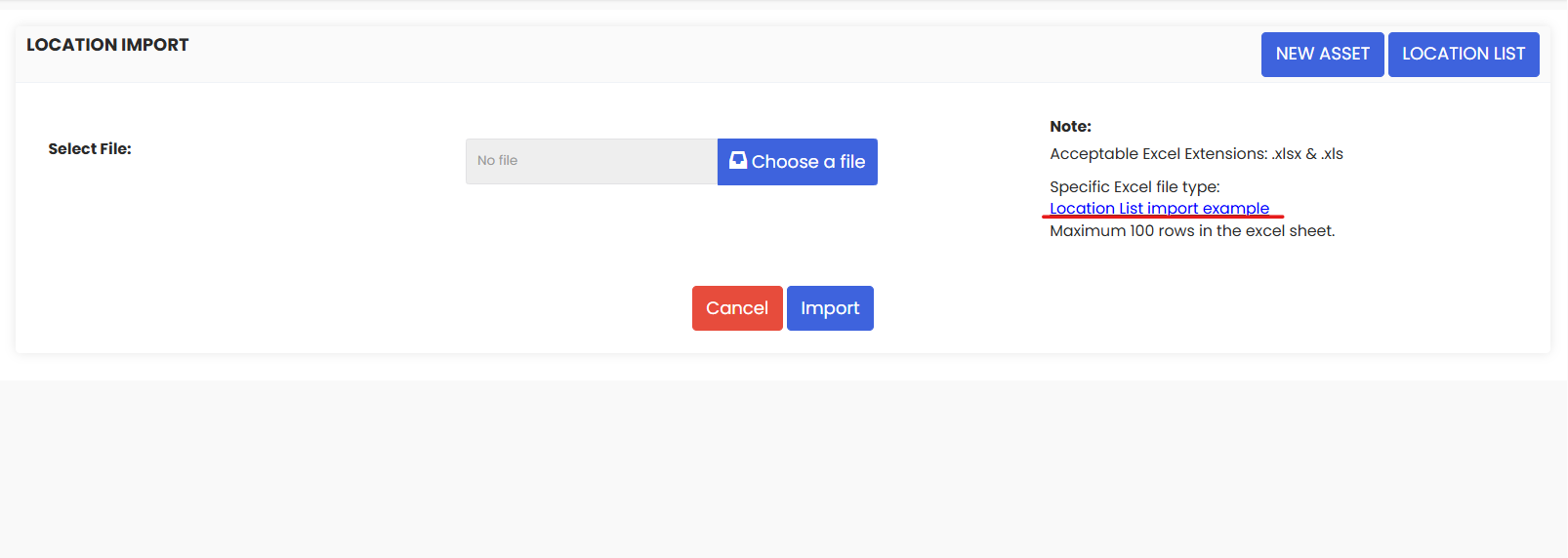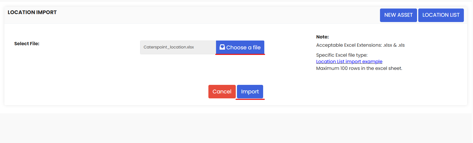 4. Upload the location file and click on Import. You will see that the locations have been imported in the system.