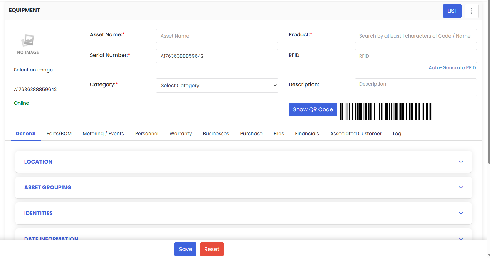 Manual Equipment Add lets you create a new asset record from scratch. Go to Assets → New Asset (Equipment), then enter the required basics Asset Name, Product, Serial Number, Category—and optionally add RFID (scan or auto-generate), description, and a photo. Expand the panels to set Location, Grouping, Identities/Barcodes, Dates & Warranty, Business/Vendor & Purchase details, Files, Financials, and any Associated Customer. Click Save to create the asset and use Show QR Code to print or tag it immediately.