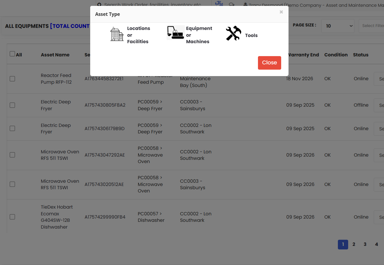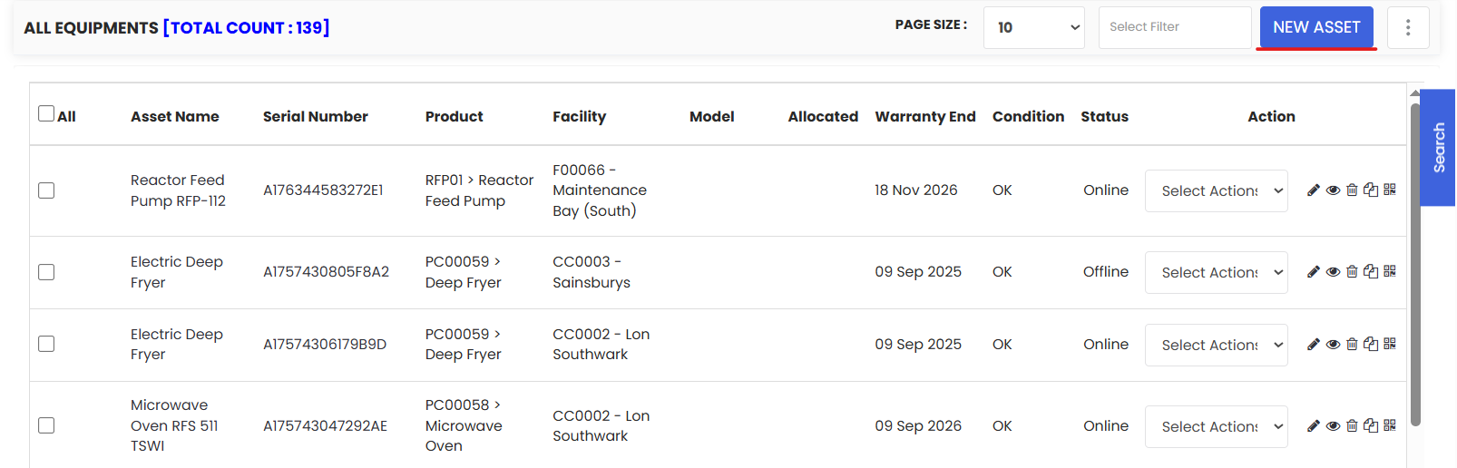 2. From the equipment list click on New Asset and then click on Equipment or Machines.