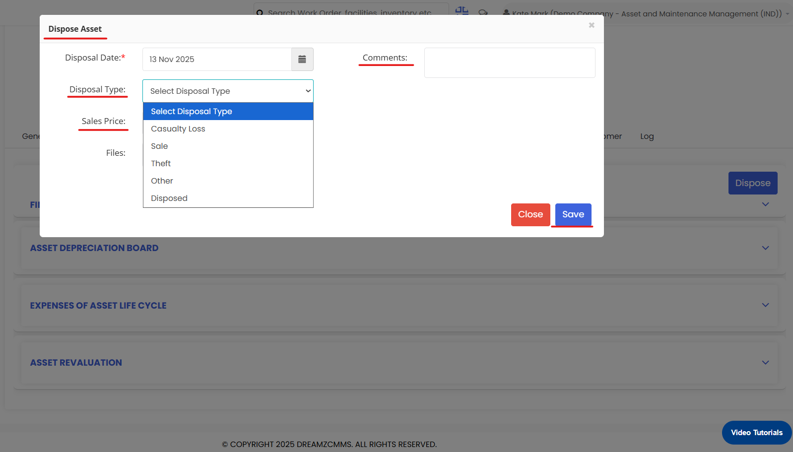 4. Now you will see a pop-up where you need to mention the Disposal type, price and put some comments for your own reference and click on Save.