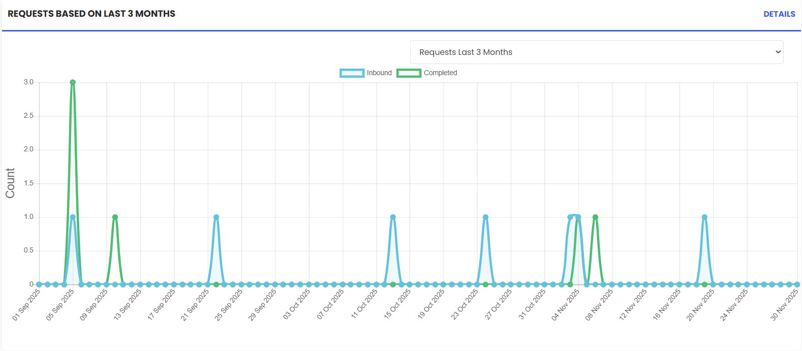 Requests (Last 3 Months): trend comparing Inbound vs. Completed to spot backlog.
