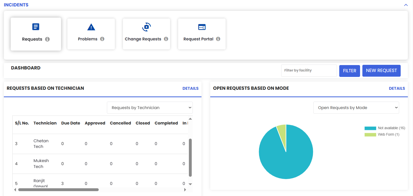 Filters & actions: filter by Facility and create a New Request.