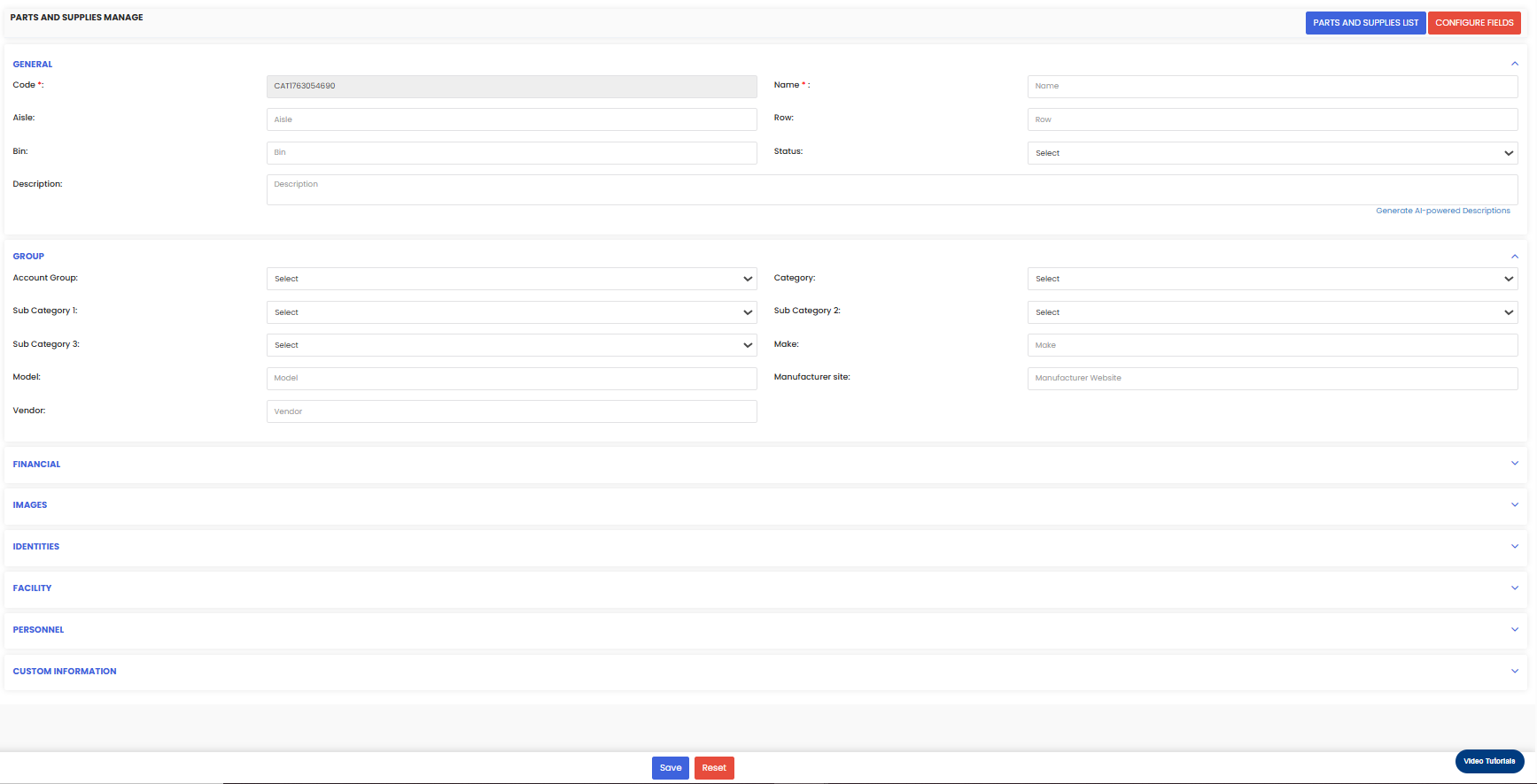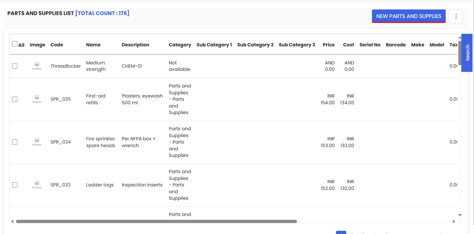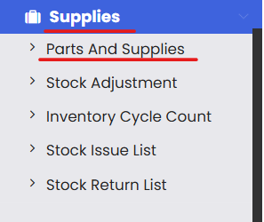 You will be taken to the listing page of Parts and Supplies. Click on the New Parts and Supplies button.