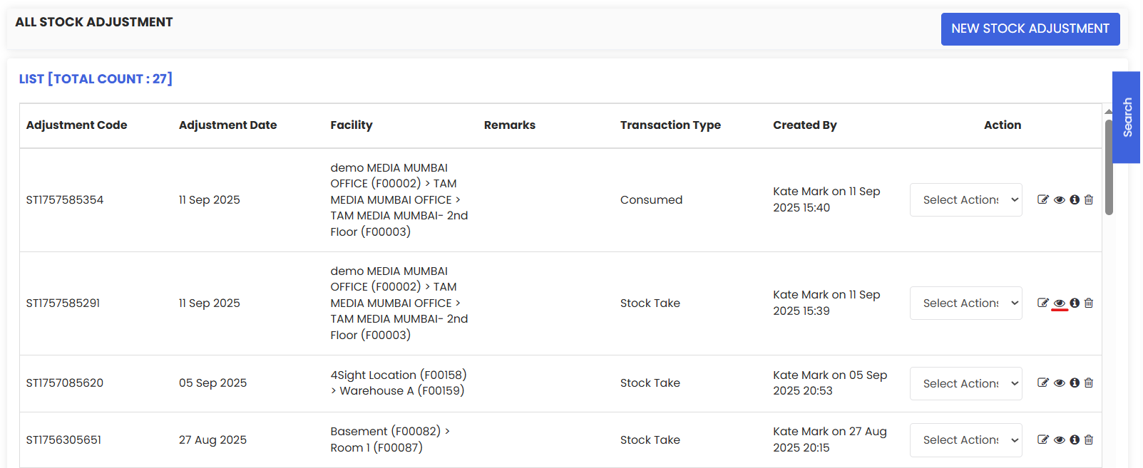Once saved, you will see the updated stock listed in the main "Stock Adjustment" screen.