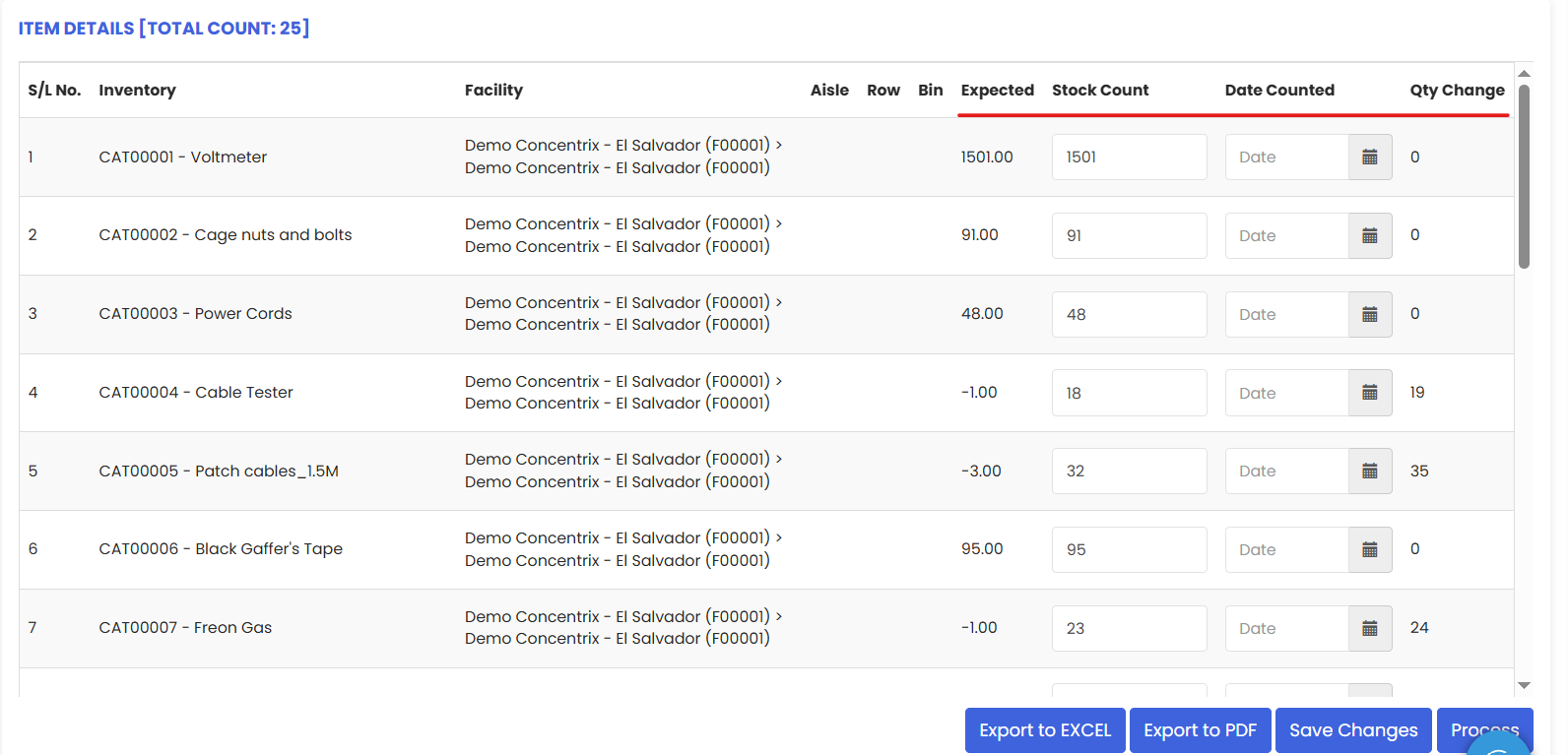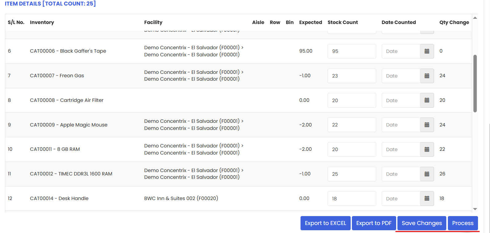 After filling the stock count column we have the option to “Save Changes” or “Process” the entries