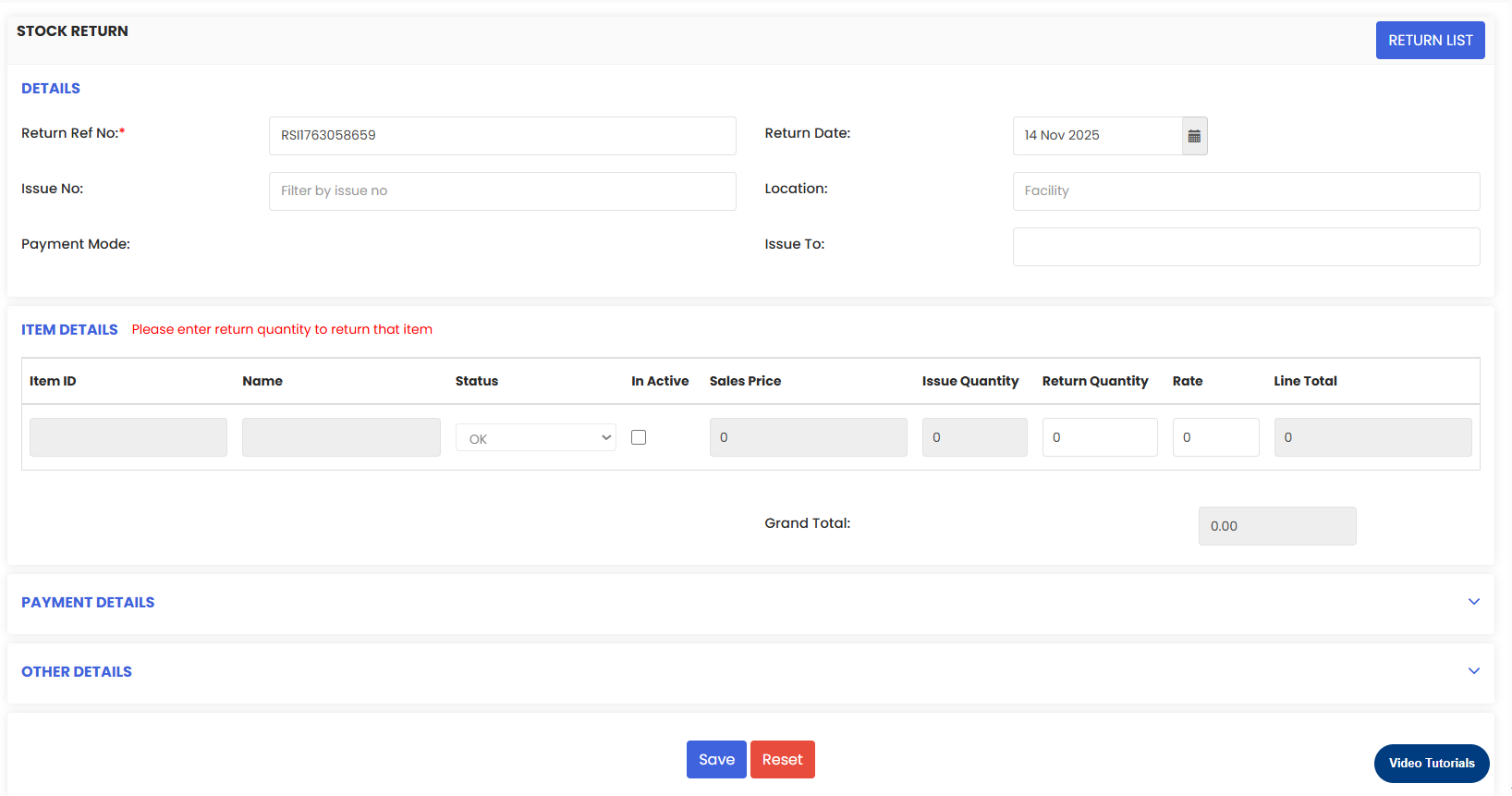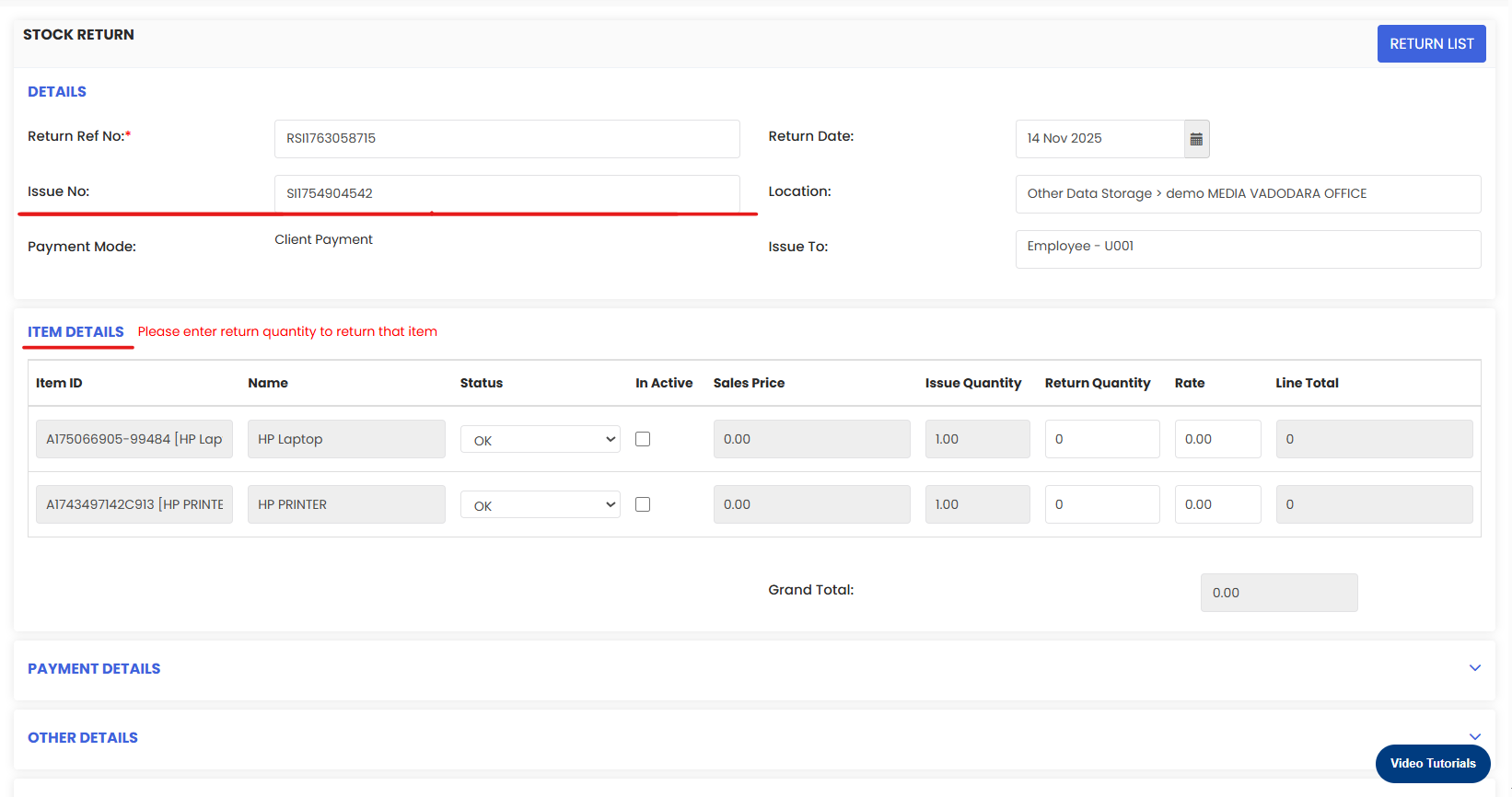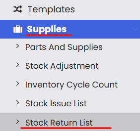 We have the option to return the stock under Stock Return” where we can put the Issue Number against which we can place the return request.