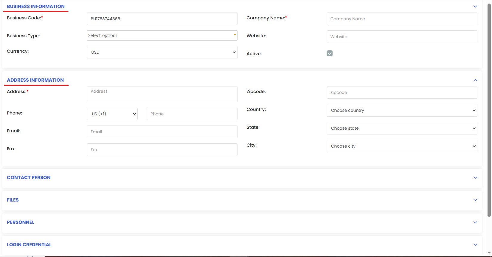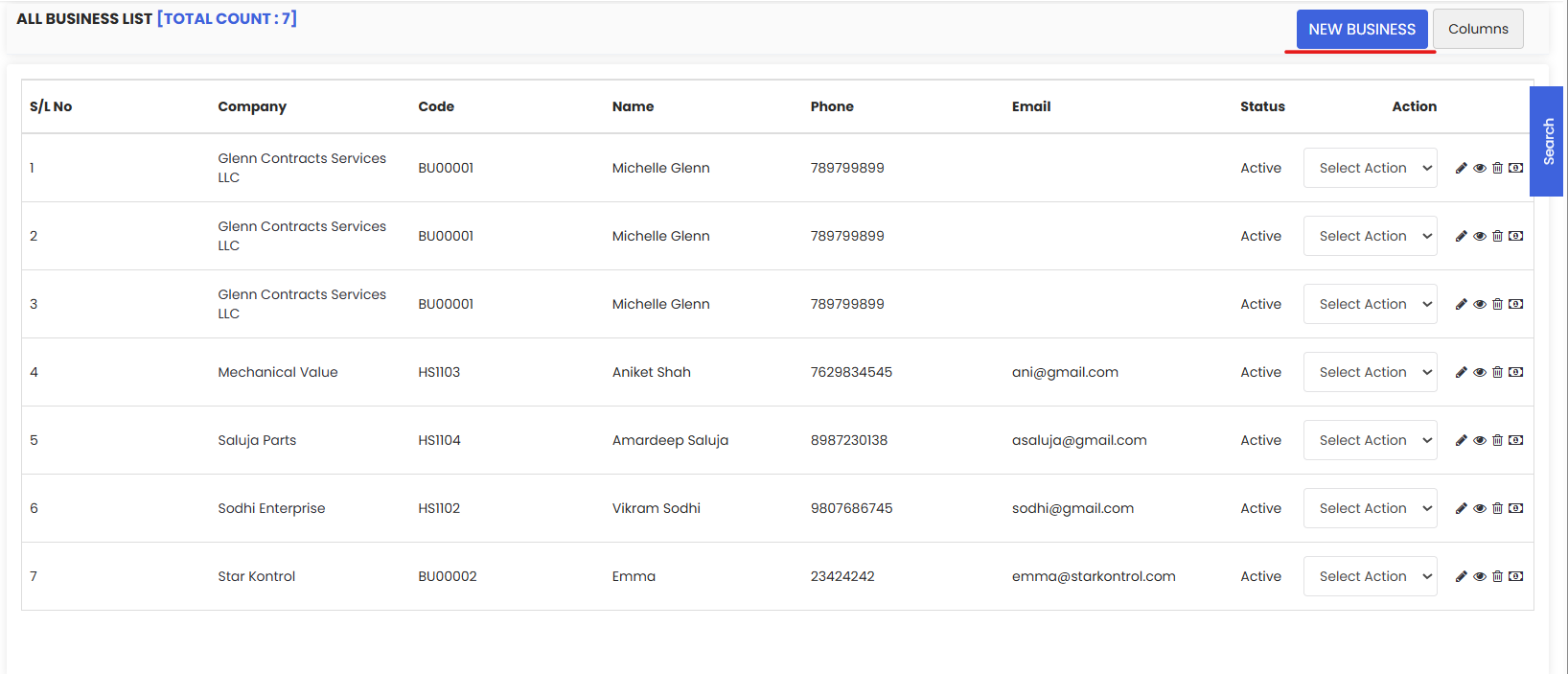 The Business module lets you maintain master records for companies you work with vendors. Use New Business to create a profile with company name, unique code, contact person, phone/email, and status. Once saved, entries appear in the All Business List, where you can quickly scan key details (code, contact, phone, email, active status), filter/search, and perform actions from Select Action (view, edit, enable/disable, etc.). This central registry keeps partner information clean, consistent, and ready to use across jobs, quotes, POs, and invoices.