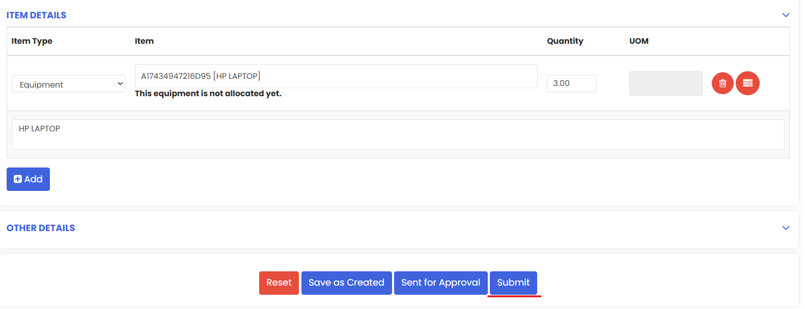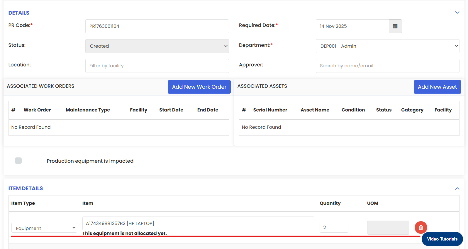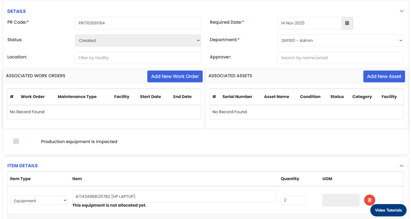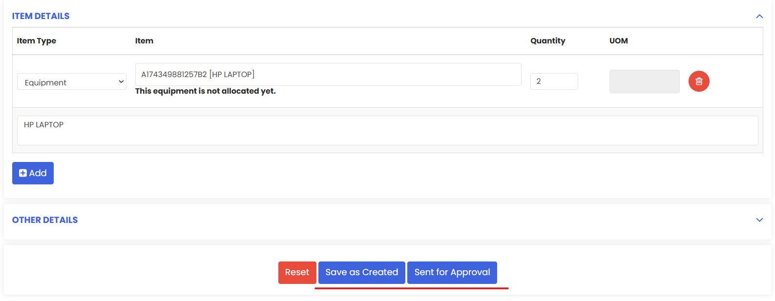 Under ITEM DETAILS section select the item type as Equipment for Asset purchasing.