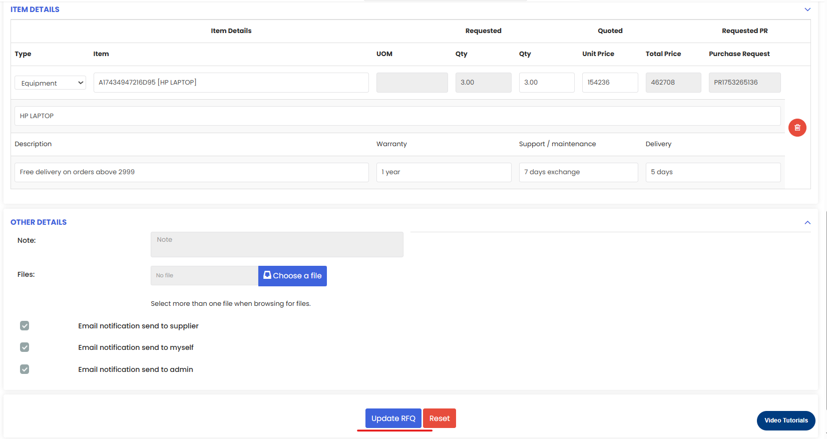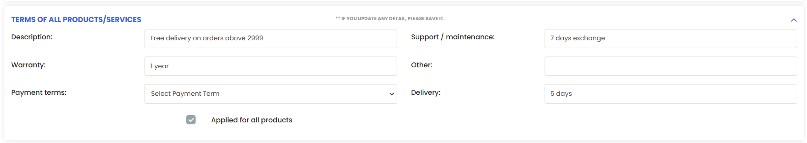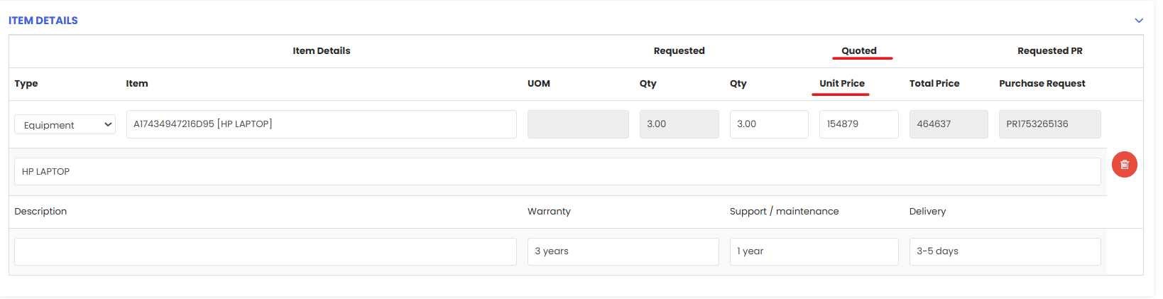 You can fill up the fields like Description, Warranty and other relevant information that may be the factors for finalizing the quotation