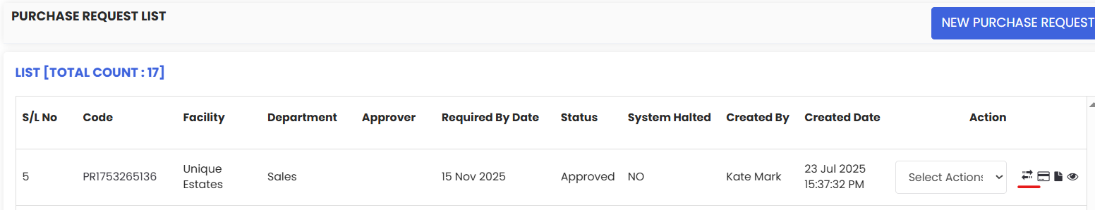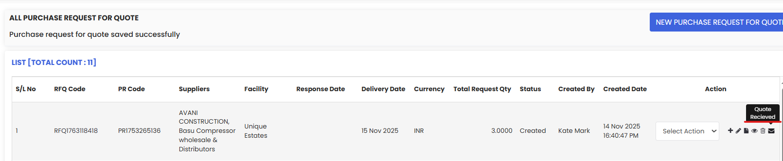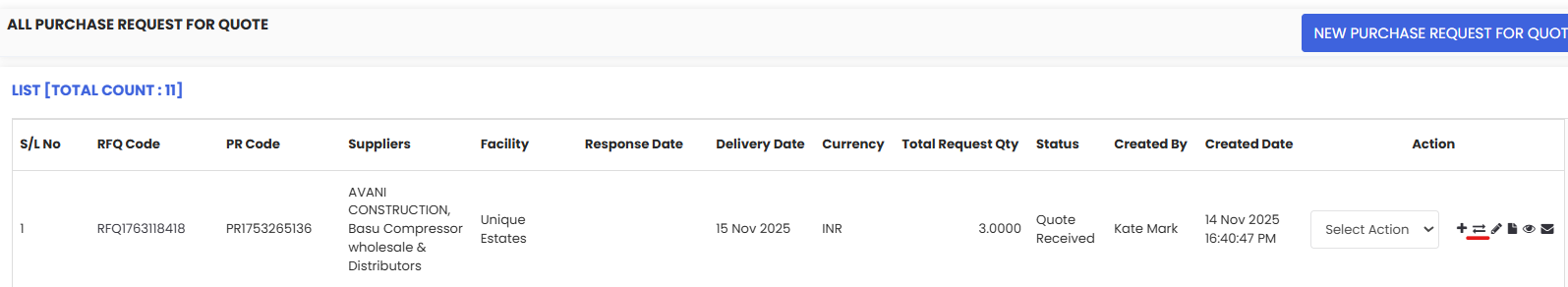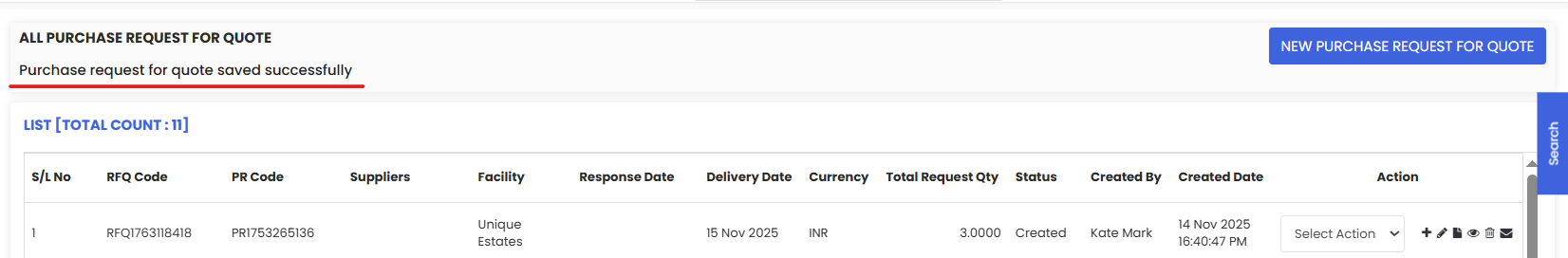 In the Purchase Request List, click on Add RFQ icon for the corresponding approved purchase request.