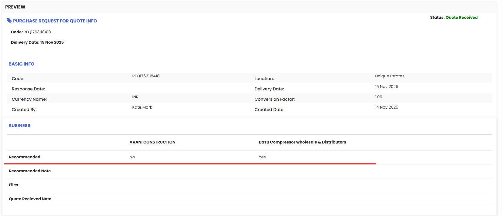 You can mark any business as Recommended which will reflect on Quotation comparison.