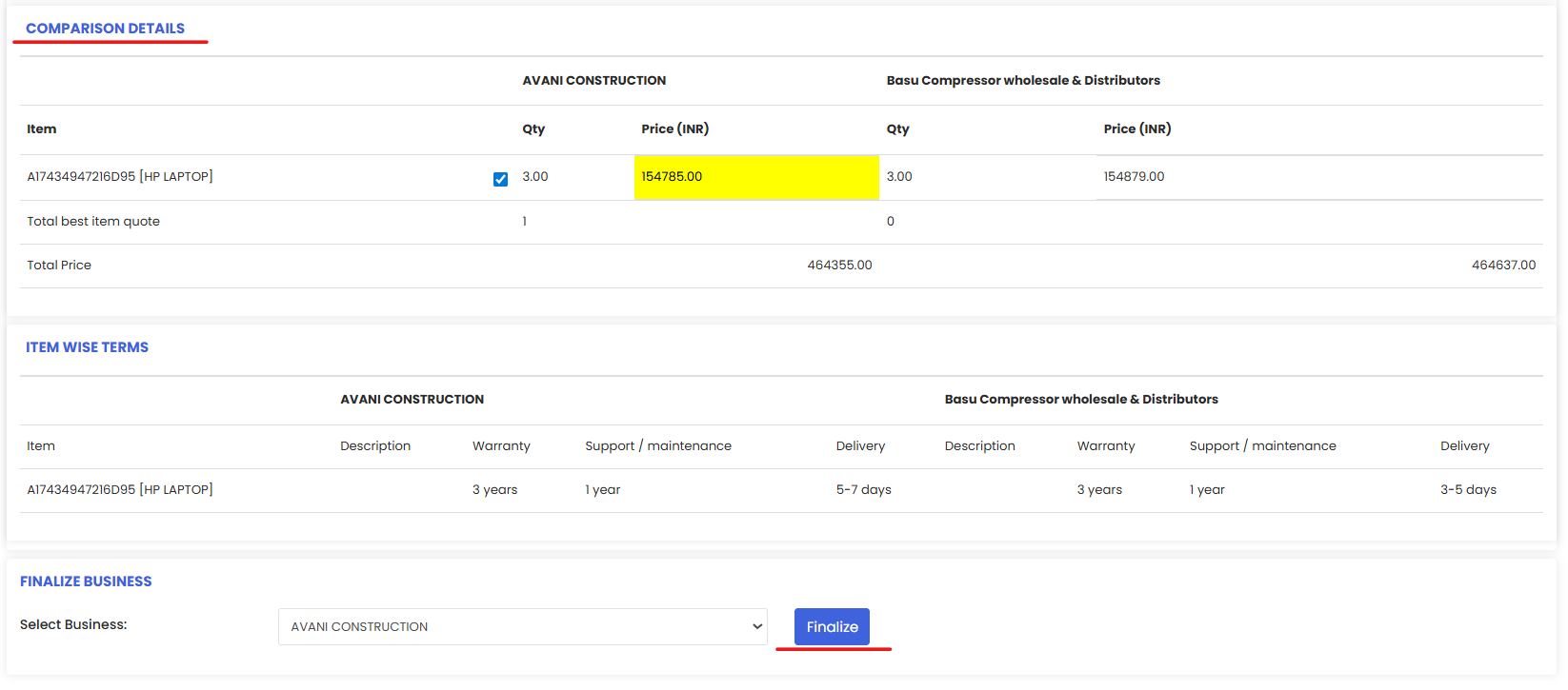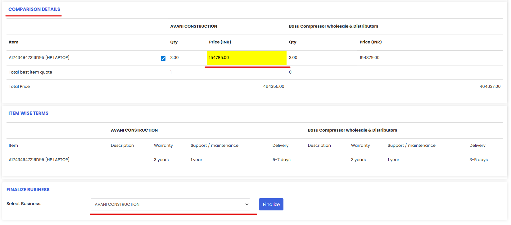 Comparison is shown with all details like Description, Warranty and other relevant information, prices are highlighted to help customers easily compare and choose the right vendor.