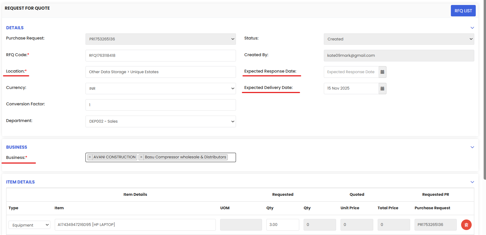 RFQ is successfully saved and the RFQ is updated with new Action buttons.