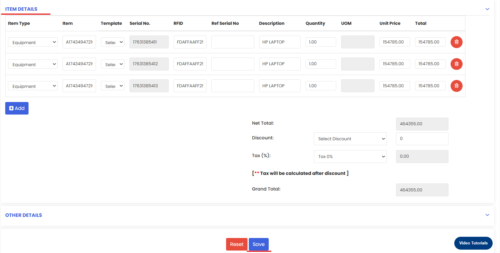 2. To create a Purchase Receipt from a PO click on the + icon. The Receipt page will open up where you need to check the item details that are present.