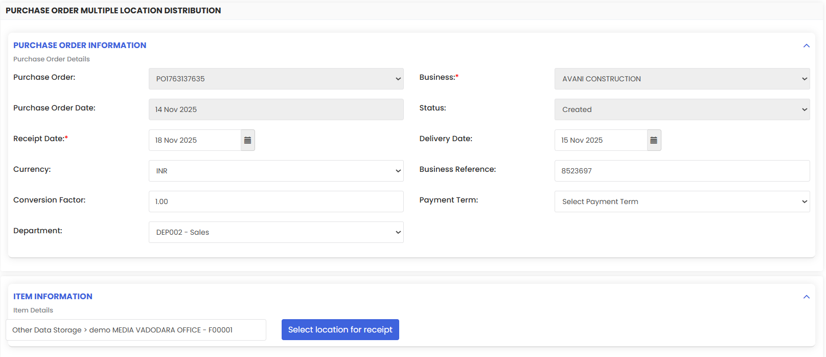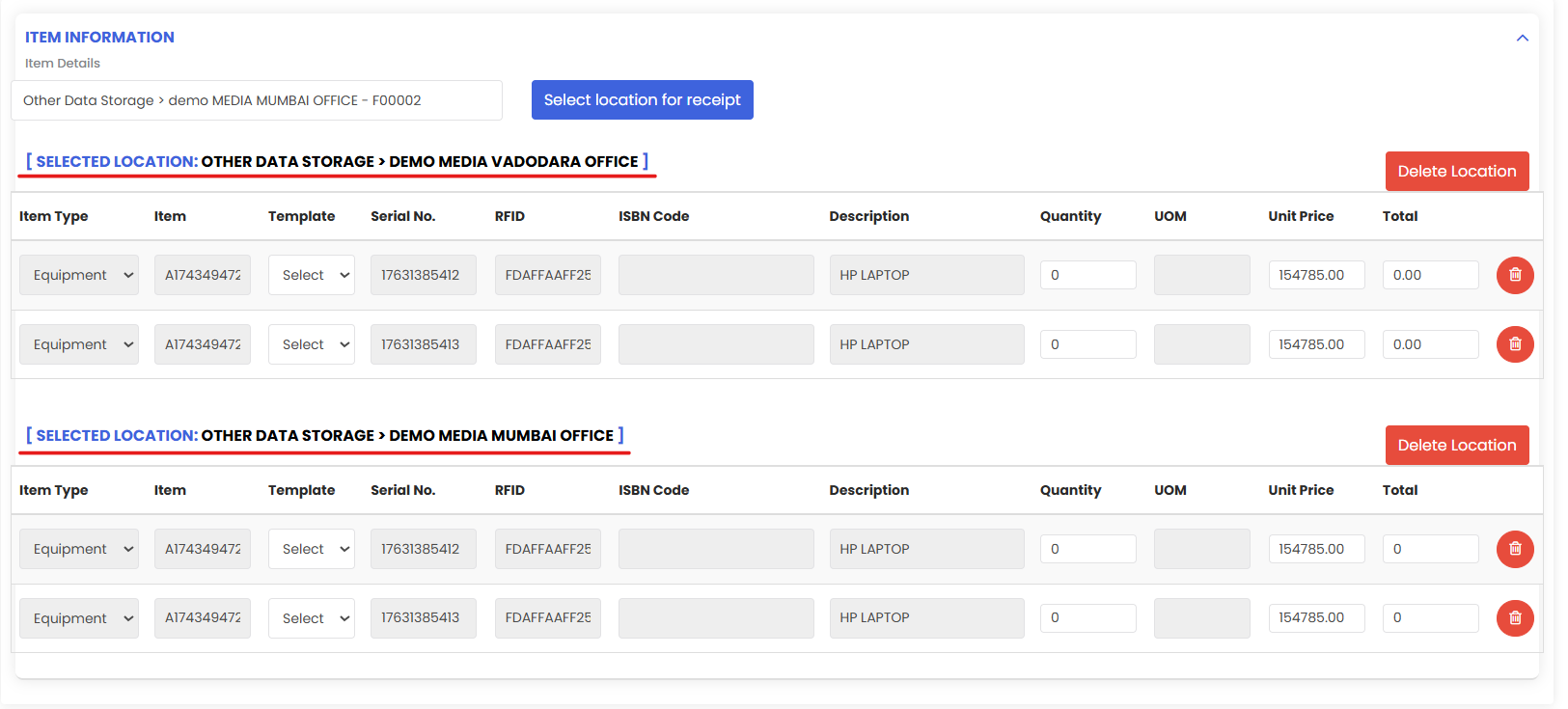 Select Location and number of quantities of that item you want to receive in that location. You can add multiple locations as well.