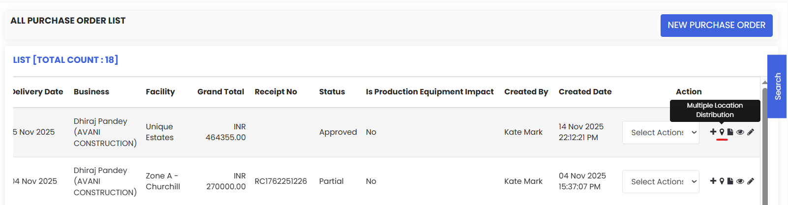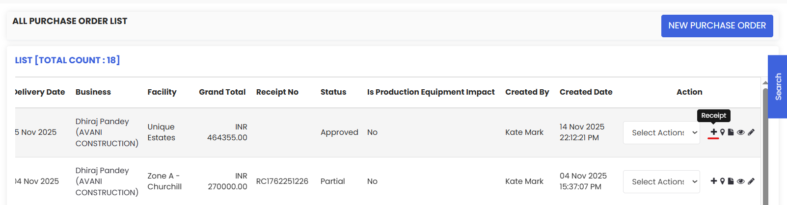 Purchase Receipts in DreamzCMMS record what you actually received against an approved Purchase Order (PO). From the PO, create a receipt to capture quantities (full/partial), lot/serial numbers, expiry/QC status, and attachments (GRN, delivery challan). The system updates on-hand inventory. You can receive items at a single location or multiple locations.