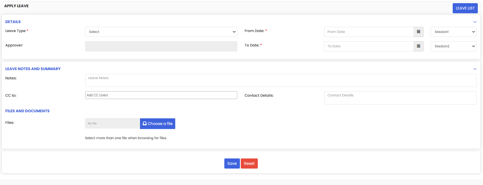 Any employee with access to the Leave Management module can submit a request by entering leave type, dates, and a reason before clicking Submit.