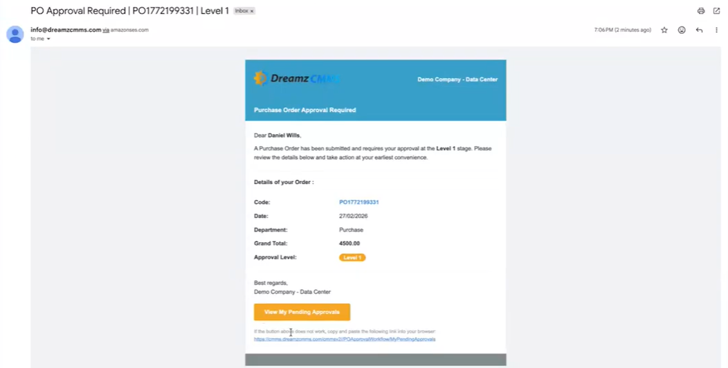 DreamzCMMS also supports Purchase Order approval workflows, commonly used for processes such as purchase order approvals.